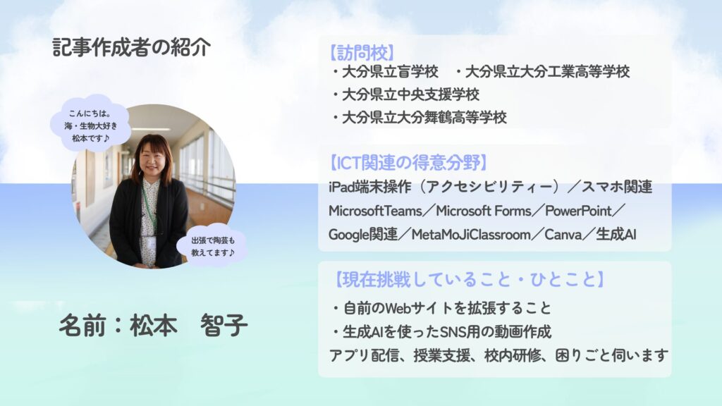 この一年、盲学校の情報推進担当でいらっしゃる末永先生とタッグを組んで、様々なICT活用推進を行ってきました。 来年度は先生のご提案で、Notebook-LMを用いて盲学校の専門性と授業の質を向上させるために、これまでの知見をデータベース化して形にしていきます。